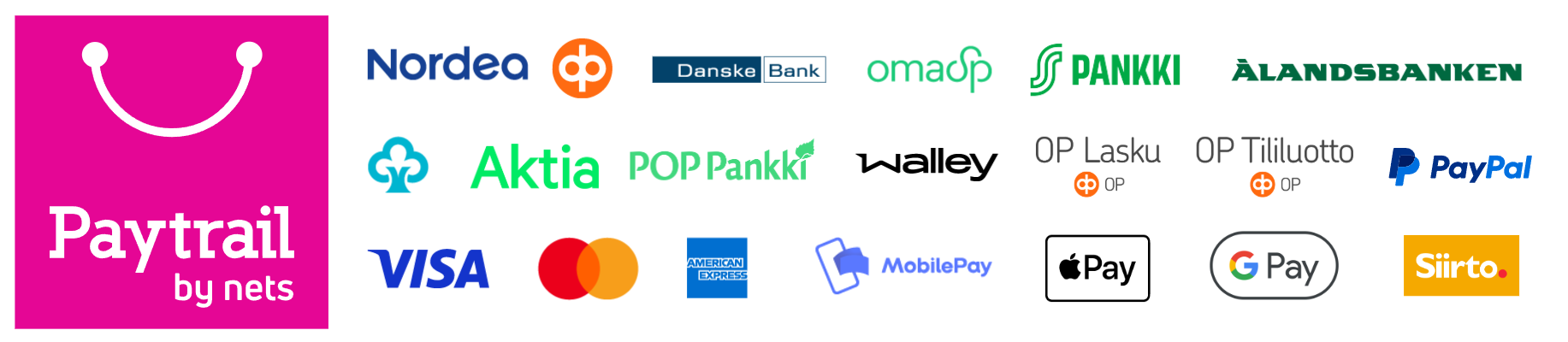 Turvalliset pankkipainikkeet ovat suomalaisten suosituin maksutapa. Meiltä löytyy kotimaisten pankkien maksupainikkeet, joihin kuuluvat Nordea, Osuuspankki, Danske Bank, Säästöpankki, Oma Säästöpankki, POP Pankki, Aktia, Ålandsbanken ja S-Pankki.