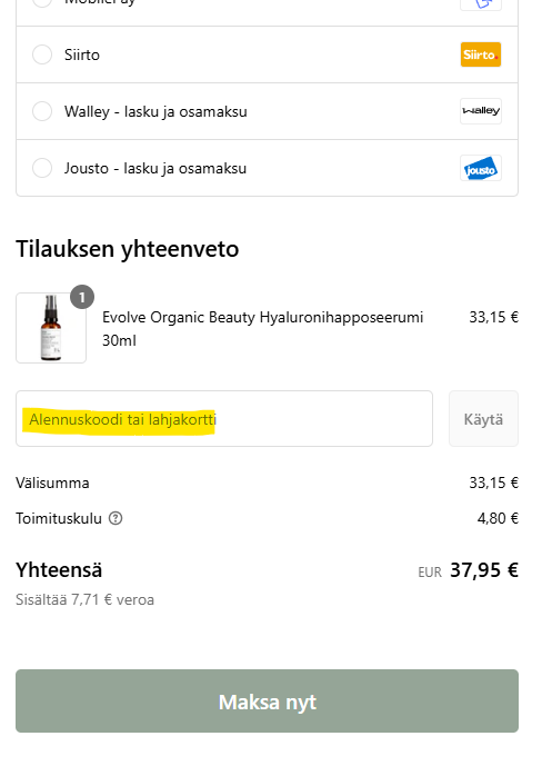 Mobiilissa: (Viimeinen vaihe ennen maksua)